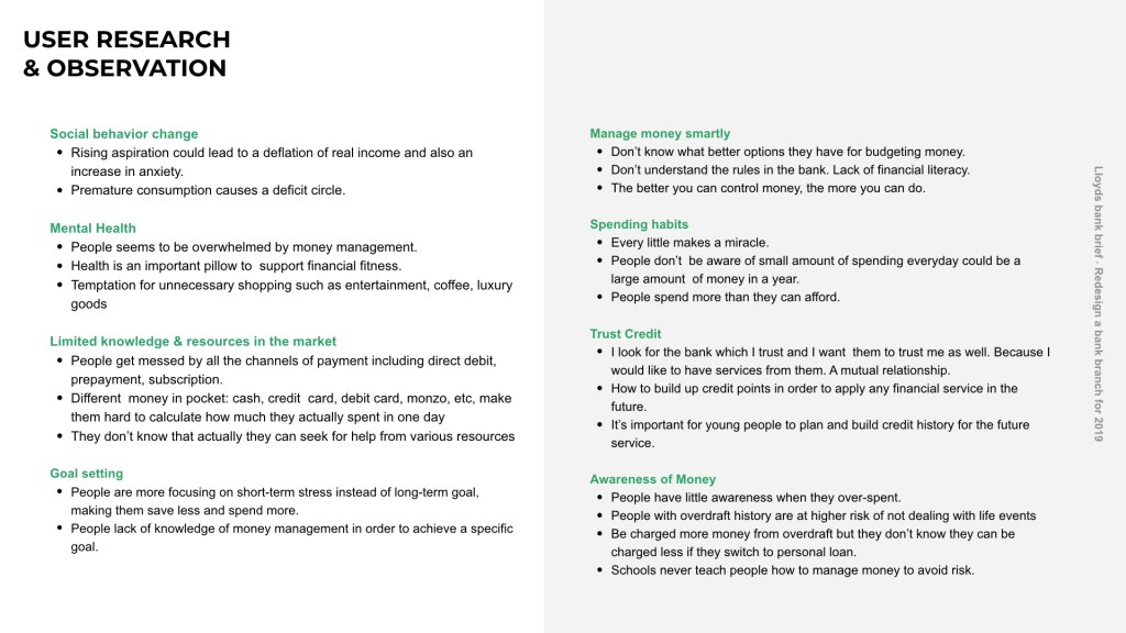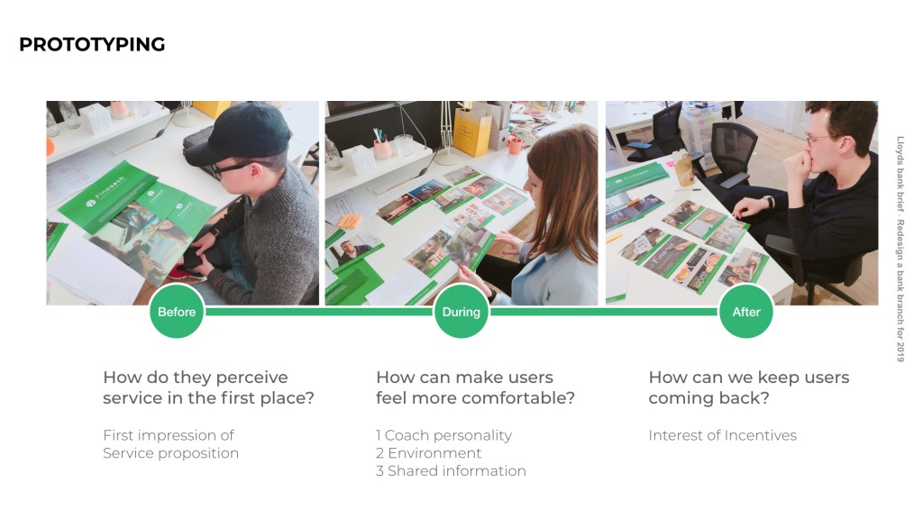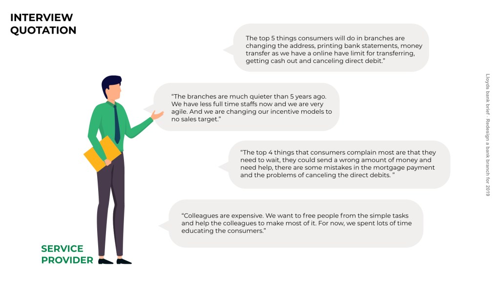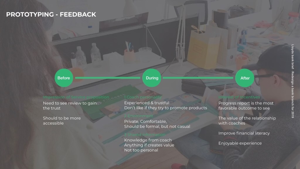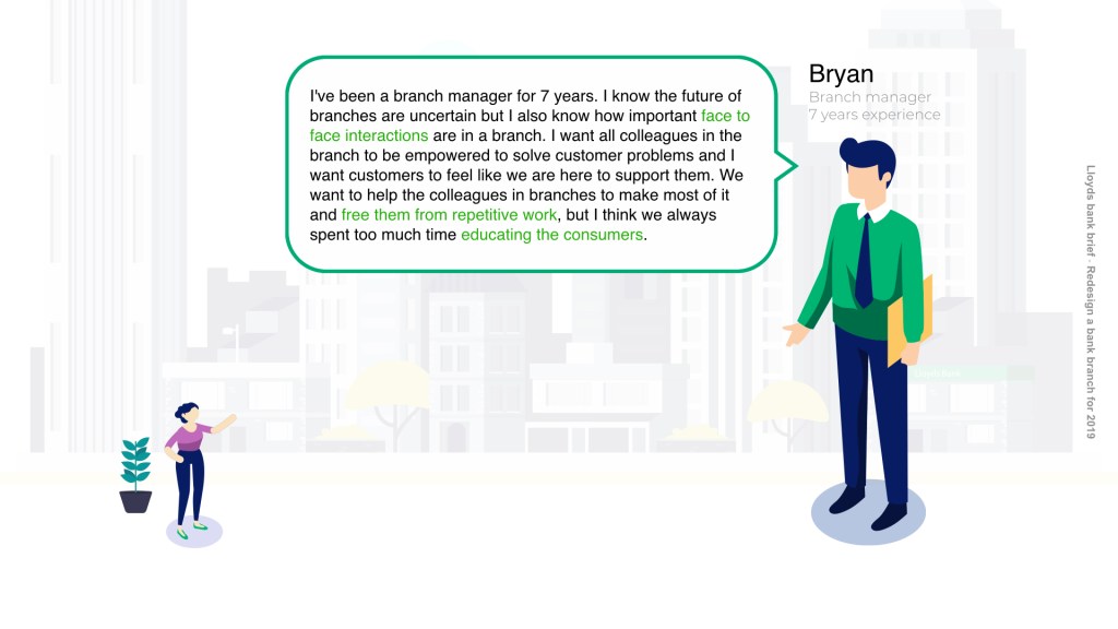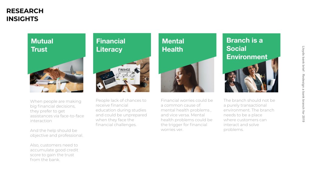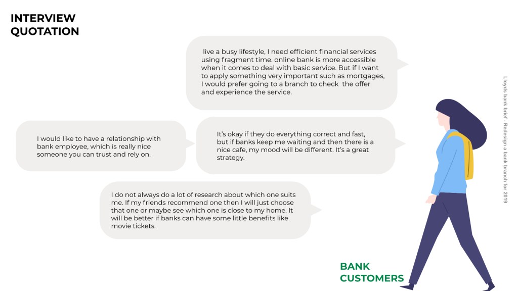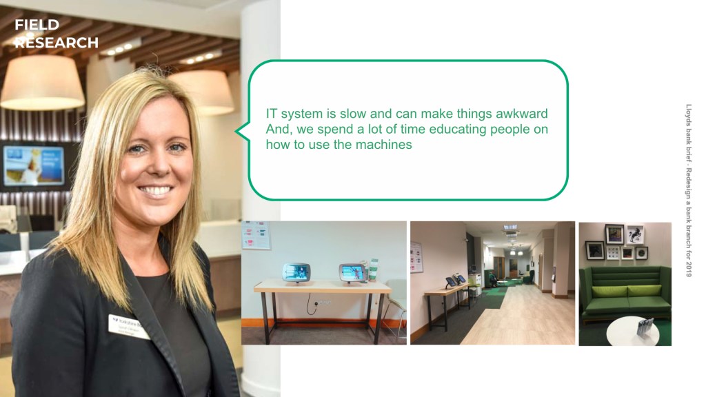 We conducted a broad desk and field research, going to 10 Lloyds Banking Group branches and its competitors. We did 25 in-depth interviews with the bank customers, employees and other stakeholders.