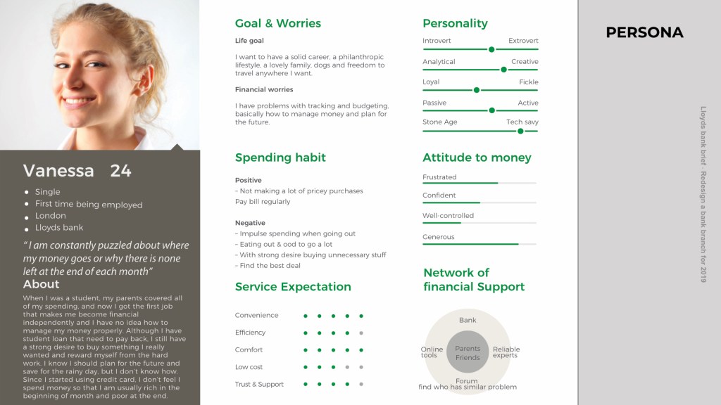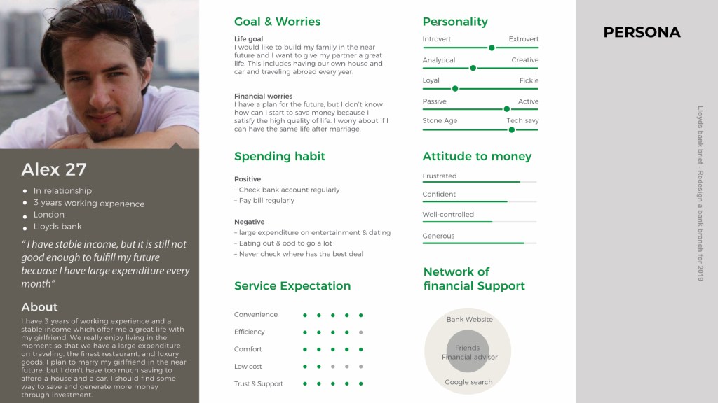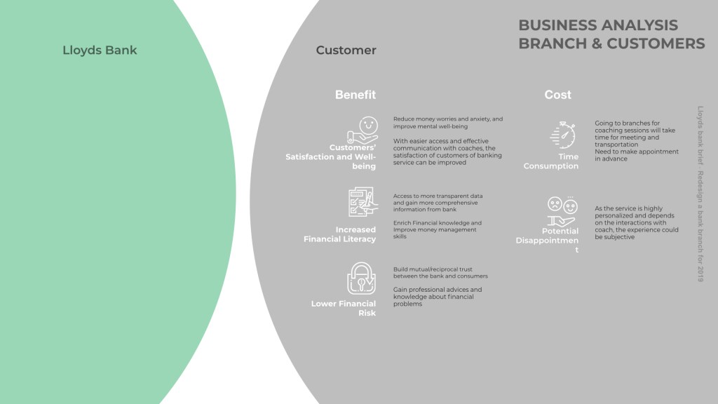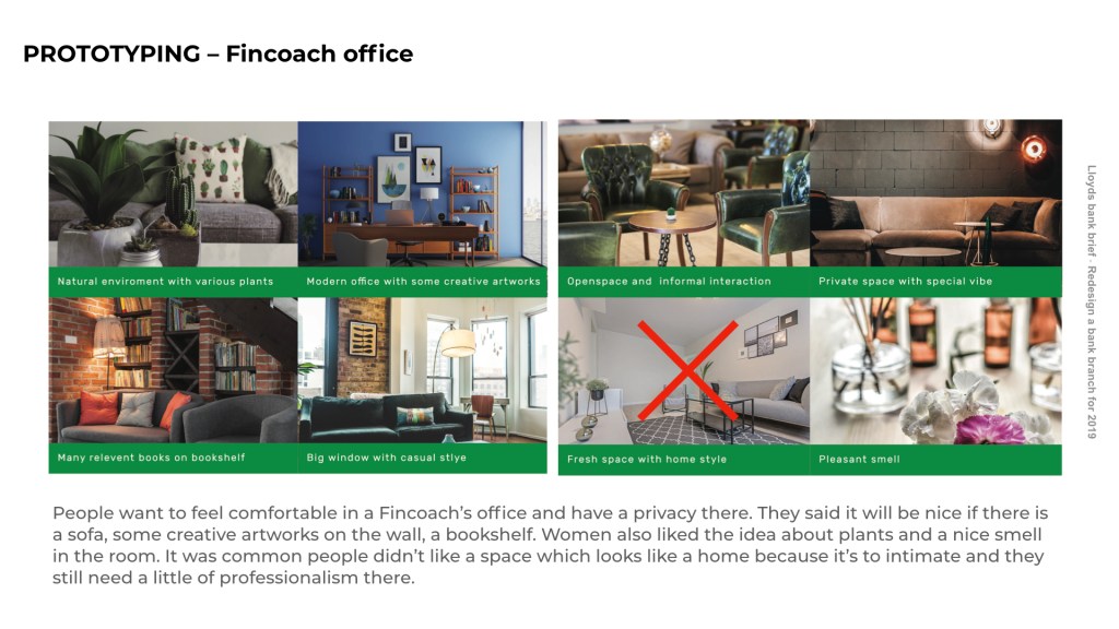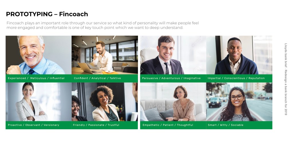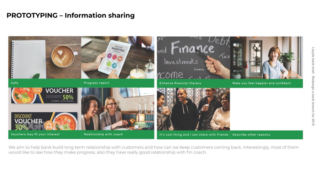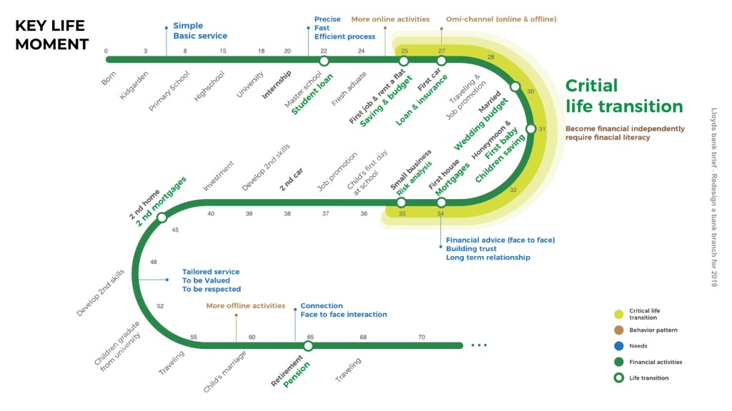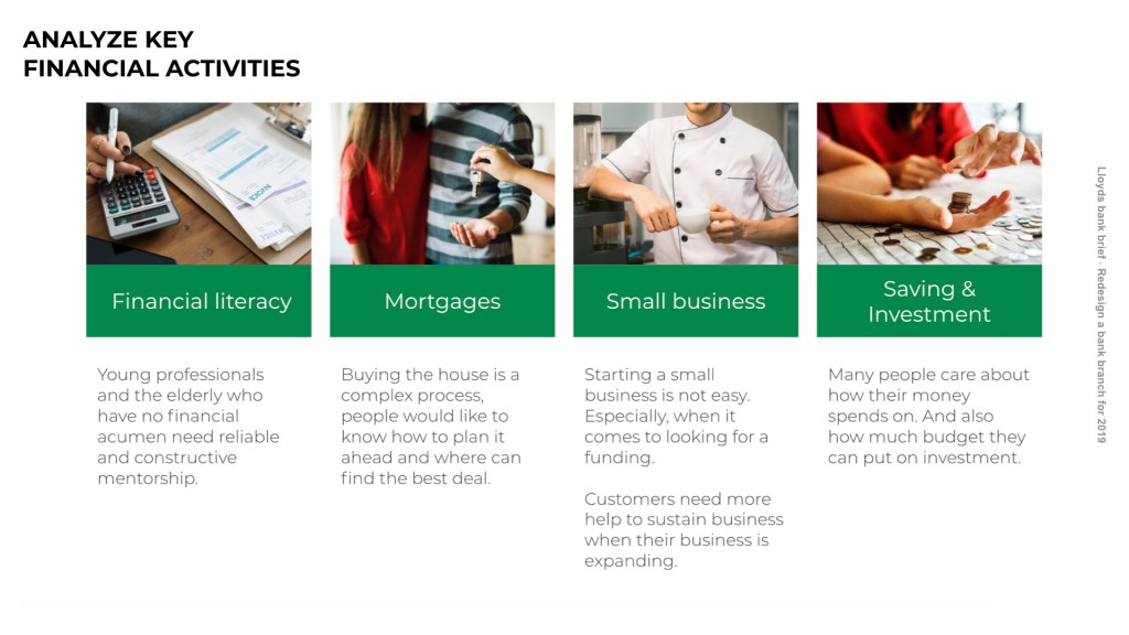 We conducted a broad desk and field research, going to 10 Lloyds Banking Group branches and its competitors. We did 25 in-depth interviews with the bank customers, employees and other stakeholders.