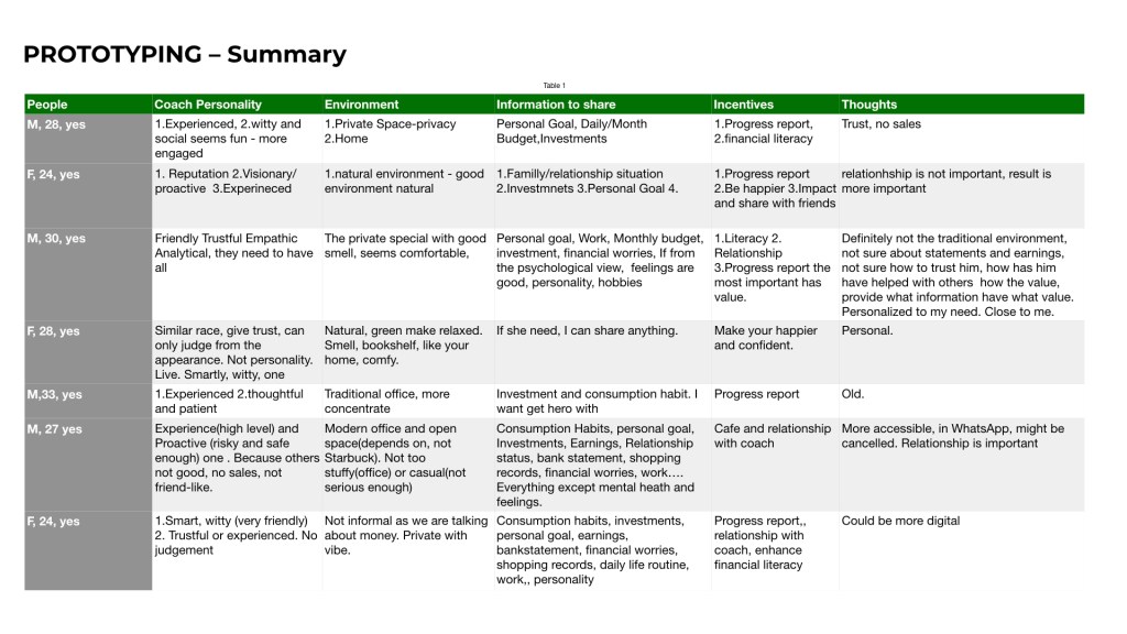 We tested with people a few elements of the service and interactions, such as: how they perceive the service in the first place, how to make users more comfortable, how to keep them coming back. To achieve this, we prototyped a Fincoach attitude, a Fincoach’s office and different ways of information sharing.