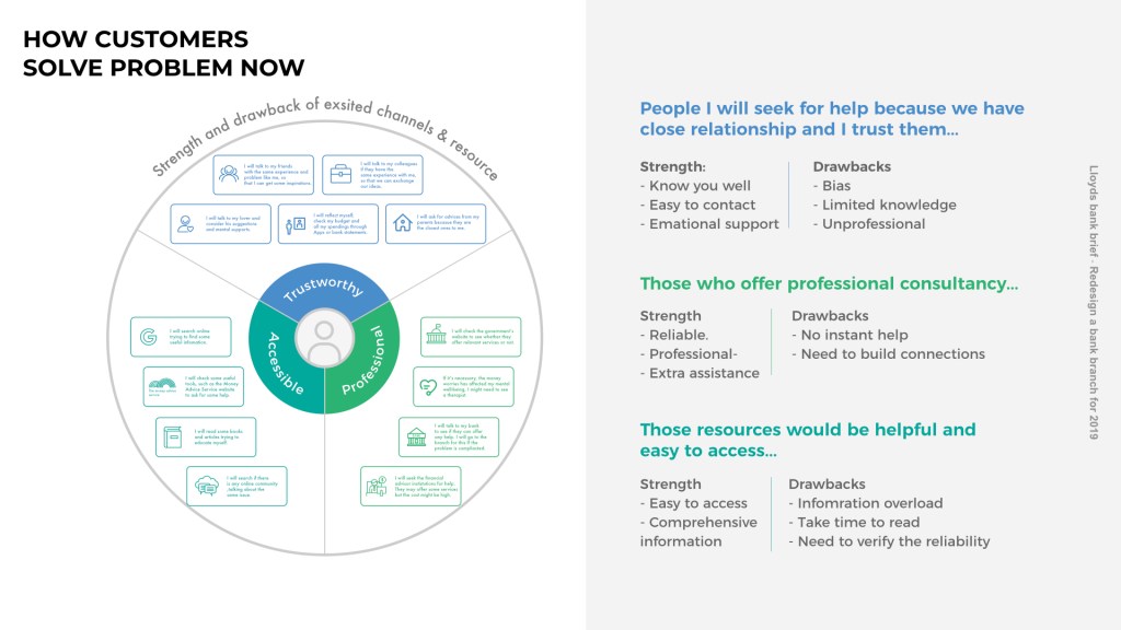 We visualised how customers solve a problem now while seeking for a financial advise. What are the strengths and drawbacks of these channels or resources.