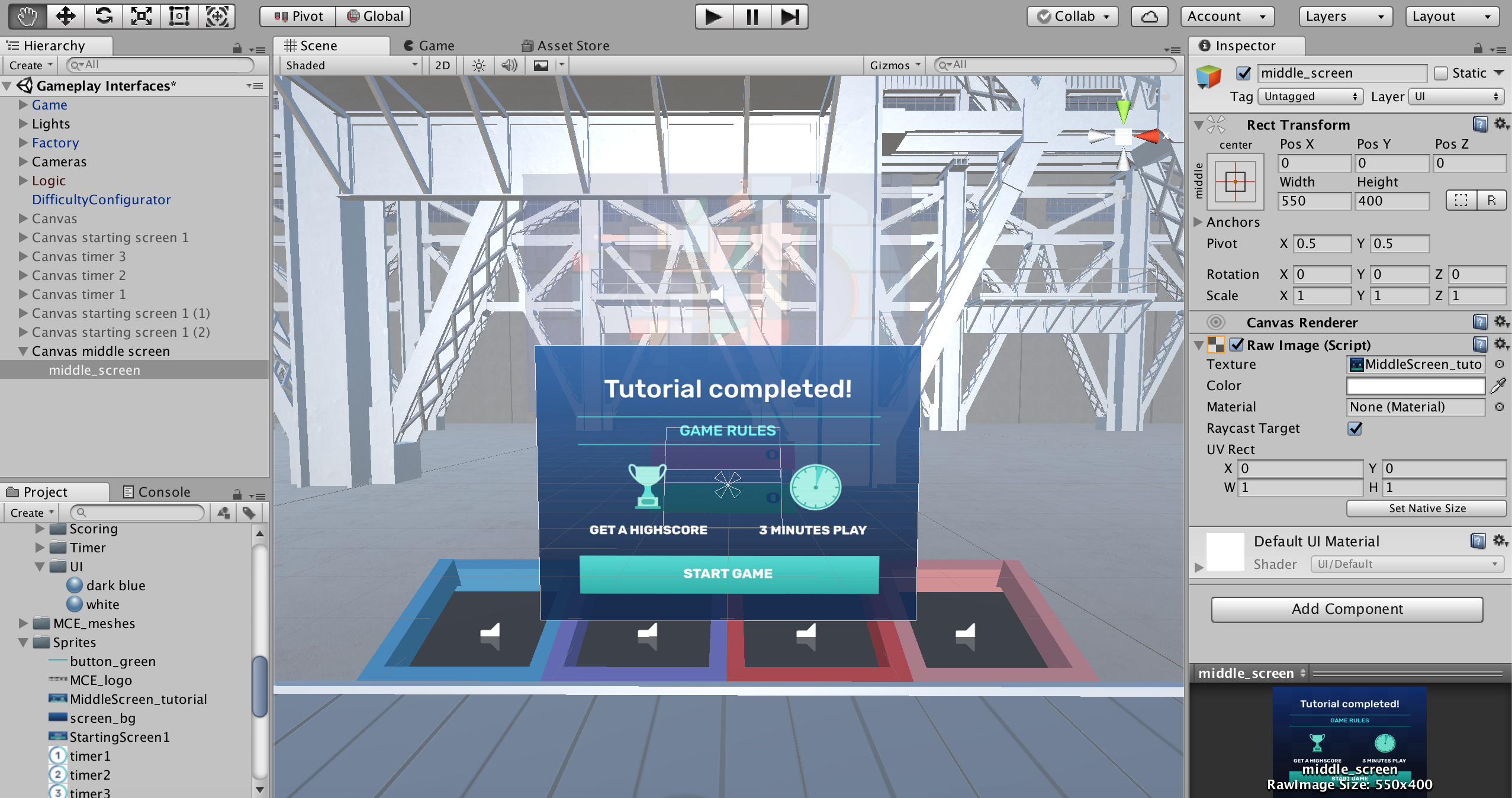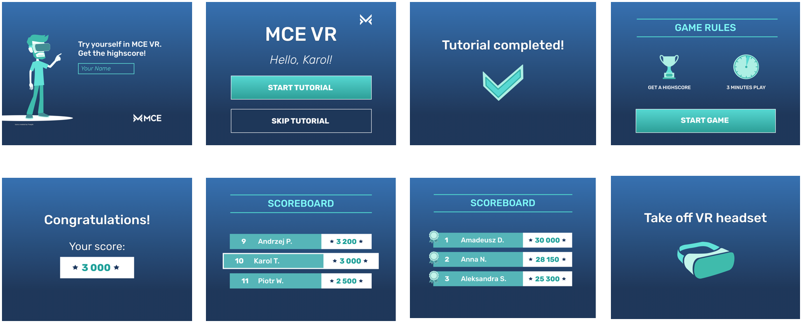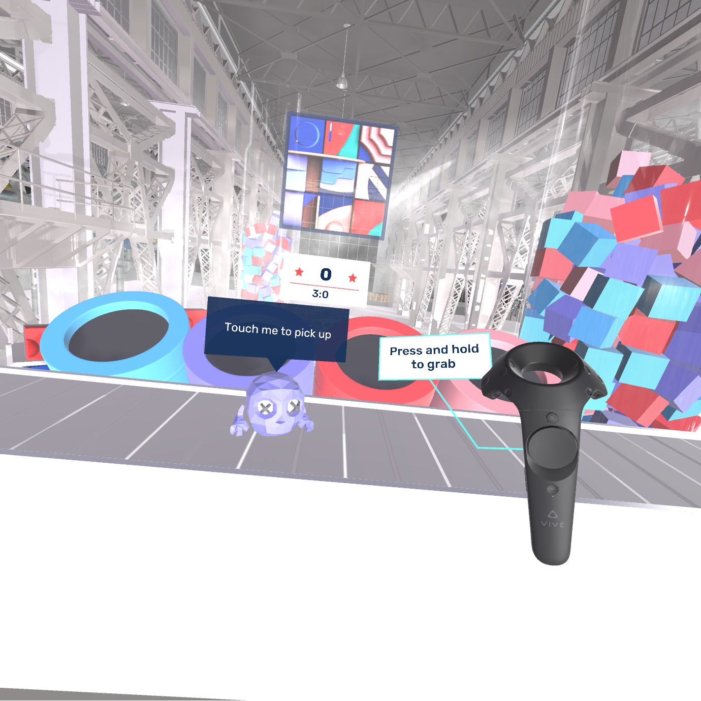 VR interaction design poses many challenges, some of which I encountered while trying to answer these questions: 1.How users should click buttons on the flat interface (laser beam interaction or more like a physical touch pad interaction), 2. What distance from the user and hight the flat interface should have, 3. How to use controllers to catch objects in the game, 4. How an on-hand tutorial should look like and where it should be, 5. How score points should be presented and where should they appear.