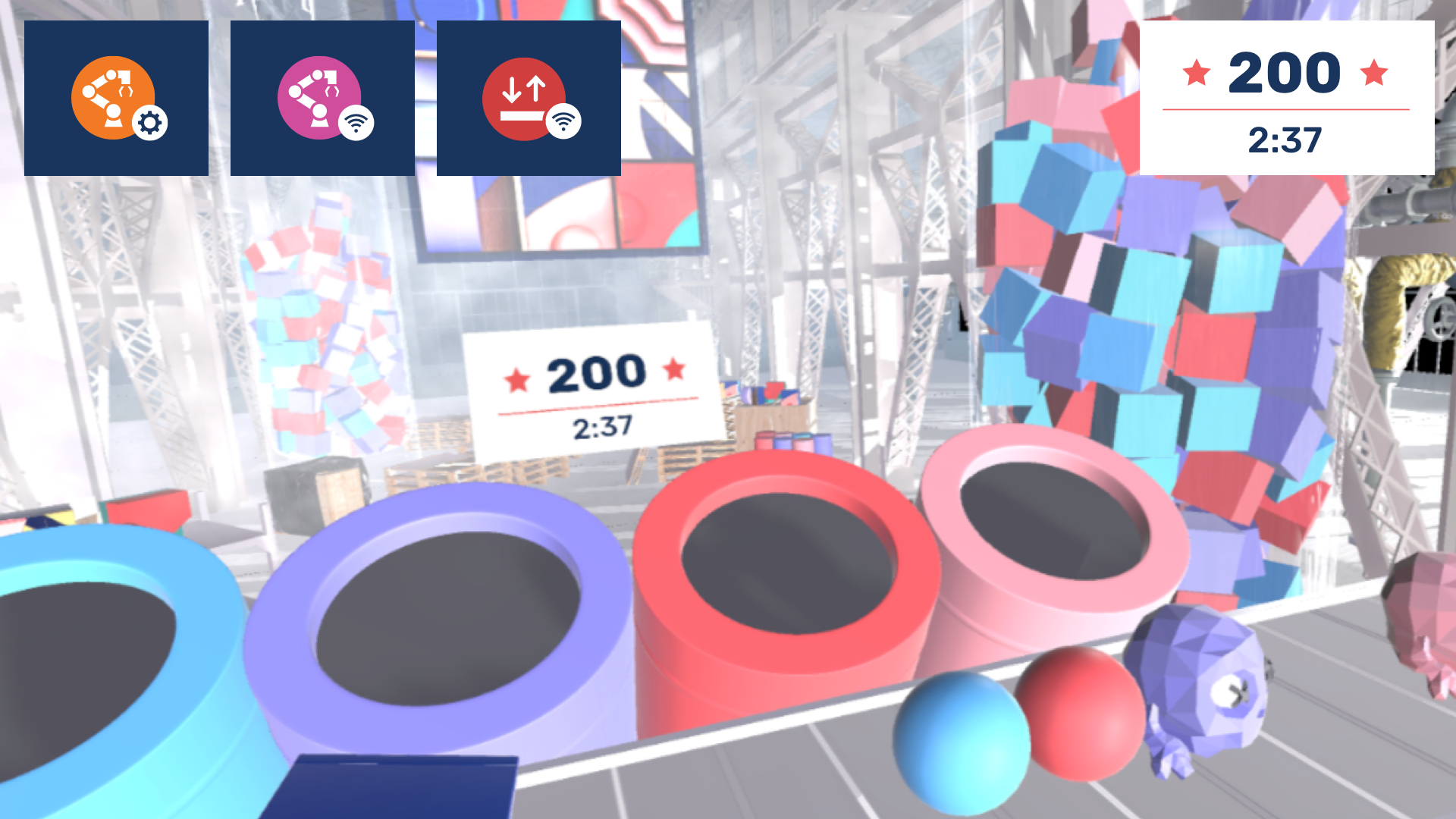 With the aim of providing business and entertainment value, and referencing the blocks concept from the conference visual materials in mind, we settled on Sorting objects on the assembly line idea.