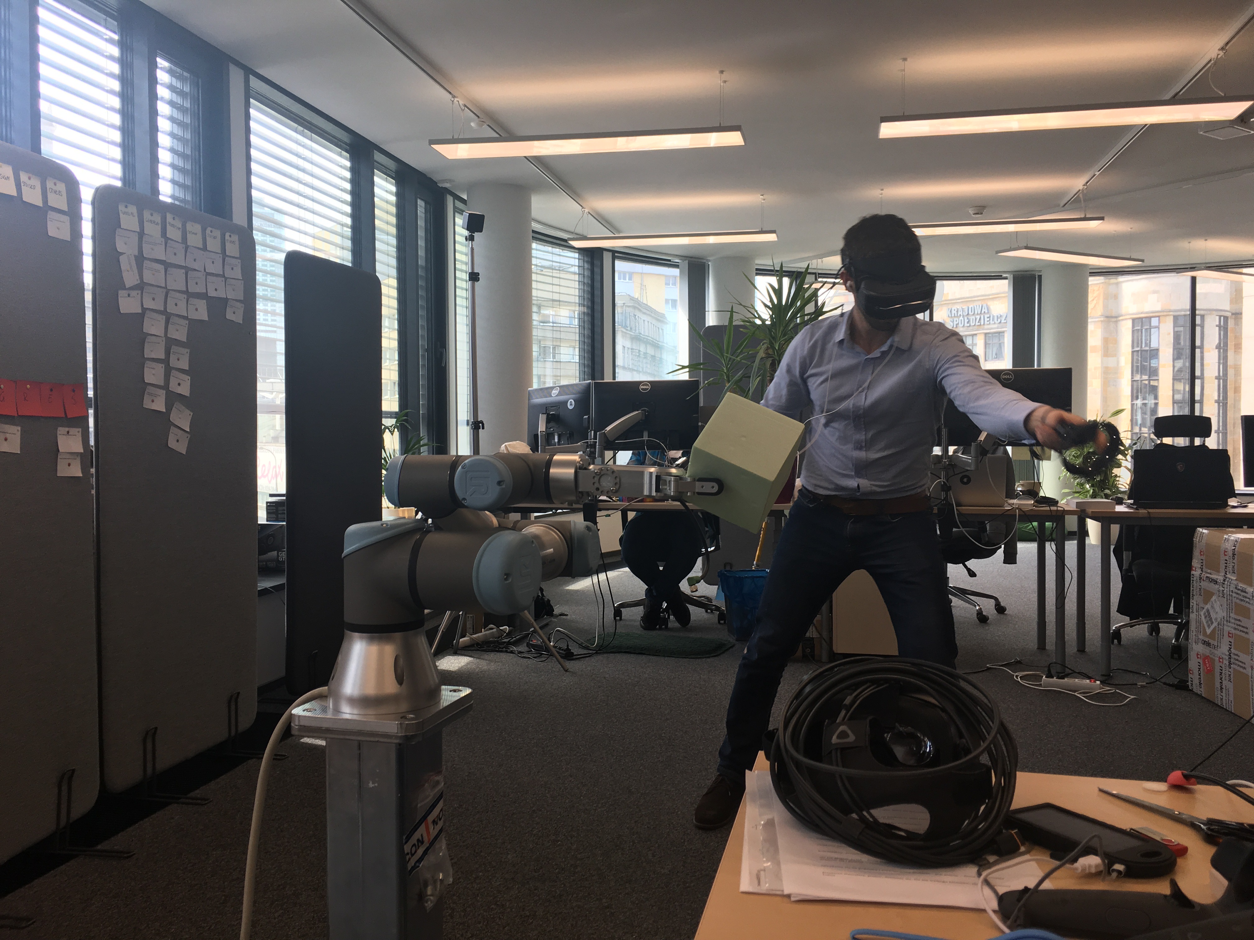 The conference took place in the Palace of Culture and Science in Warsaw. A building wing housed the VR Space that included a Stand with our project: a user in VR and a Robotic Arm with other objects that it interacts with its choreography.