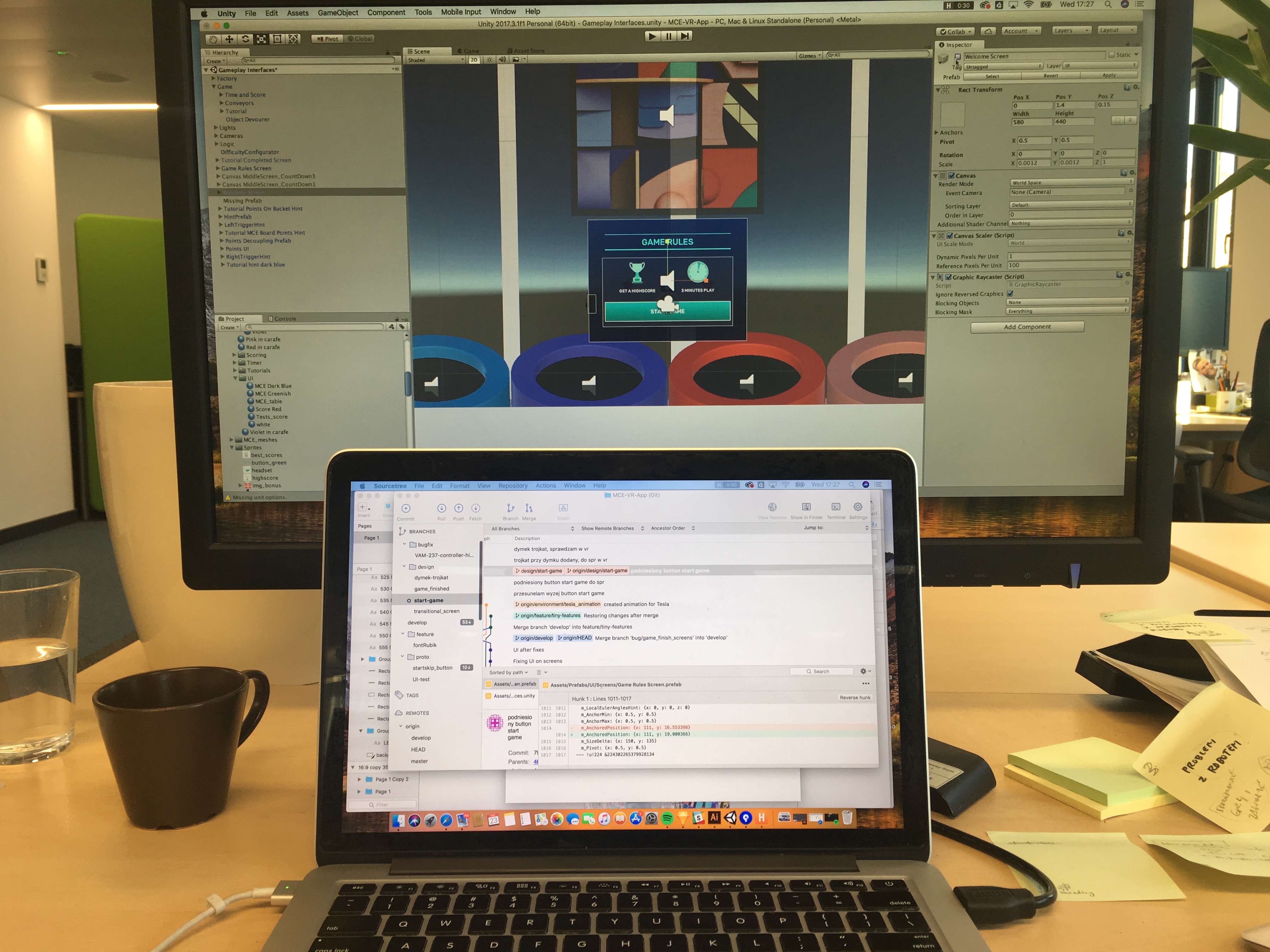 I worked on separate branches which might be integrated in Unity by an engineer later. He taught me how to add some simple interactions necessary for our game and would follow with building more complicated ones himself.