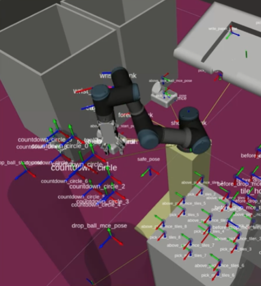 A Robotic Arm has a choreography while counting down until the game begins and ends. Also every time when a user throws a special MCE block into the MCE board in front of them, a Robot takes a physical MCE block and puts it into the same place on the physical MCE board/shelf.