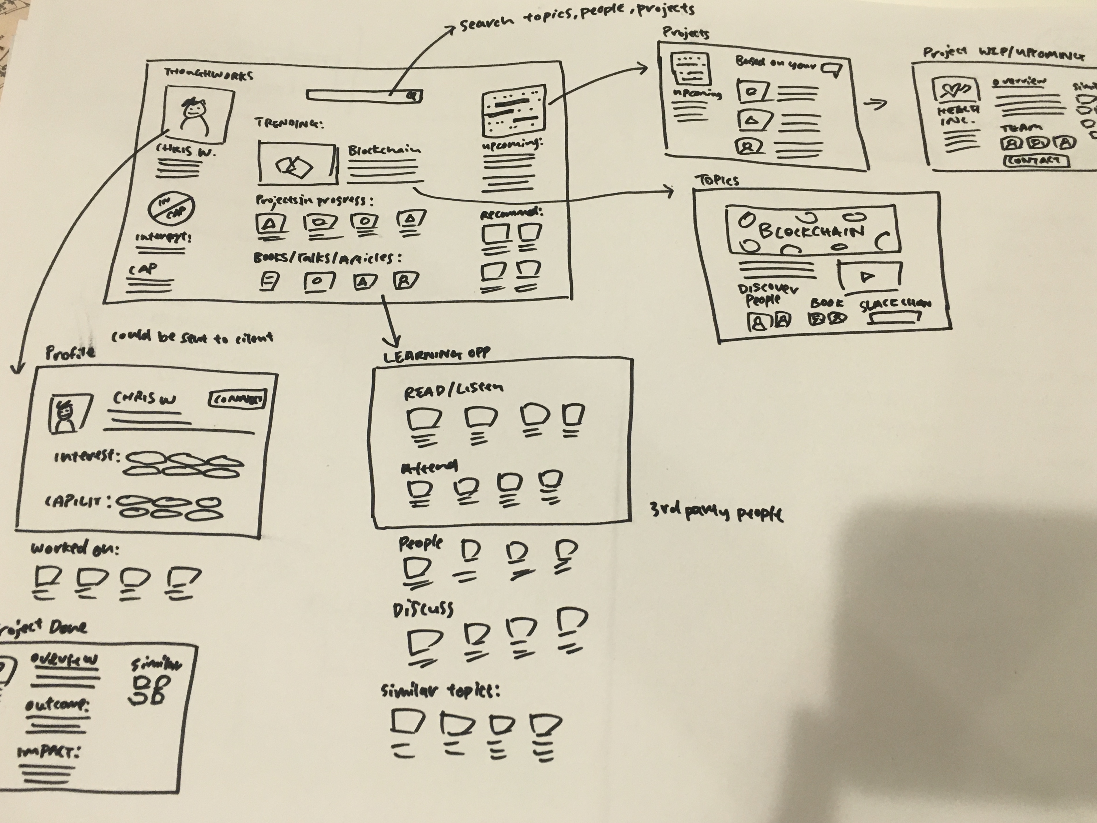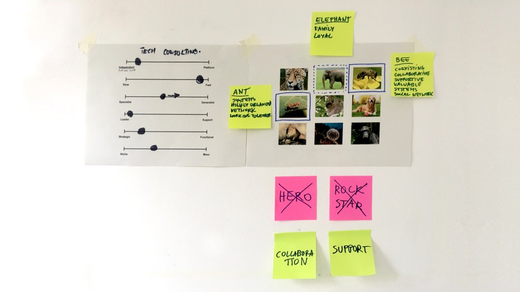 We wanted to learn more about ThoughtWorks and what growth means to them. We did two exercises: First, was as a measurement. There were 6 factors, such as specialist and generalist, and they had to mark where they were and where they wanted to be. Second one, was an animal association, in which we learned more about what was important to them, their values, such as collaboration. With that we came up with an analogy that helped understand the landscape and growth.