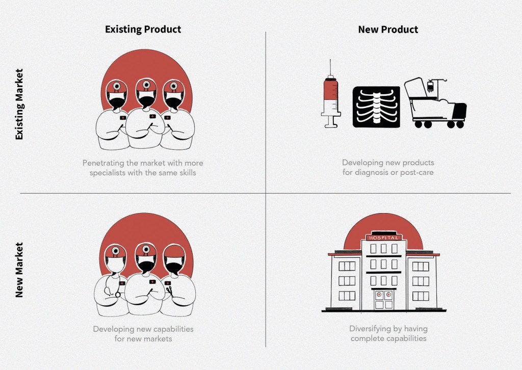 With Roobiks we can grow more surgeons with same expertise. Then train the new surgeons with different expertise or come up with new services. Roobiks is enabling ThoughtWorksk to grow in the top left quadrant, making them capable of entering a new market, come up with new products or eventually enter new markets with new products. On the viability side we explored “post care” as a potential new service offering which is relatively easy to offer to cushion overall revenue as more challenging capabilities are being build in the meantime.