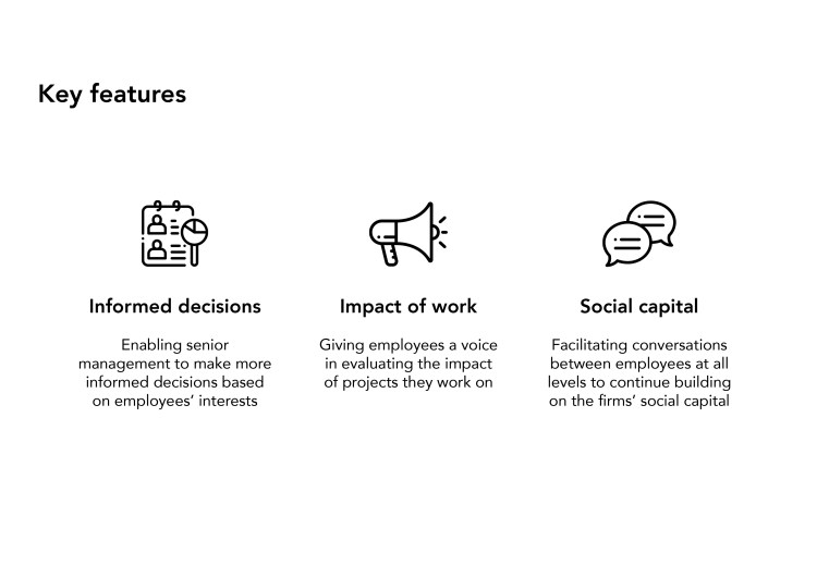 How: Roobiks ensures a two way interaction between senior management, project managers and employees by making use of digital tools, as well as physical artefacts as conversation starters and means to provide necessary information. Roobiks identifies employees’ career trajectory and interests to provide them with the most suitable projects while also assisting senior managers and project managers to make better informed decisions.