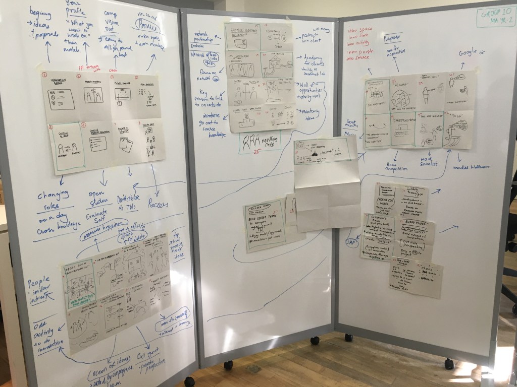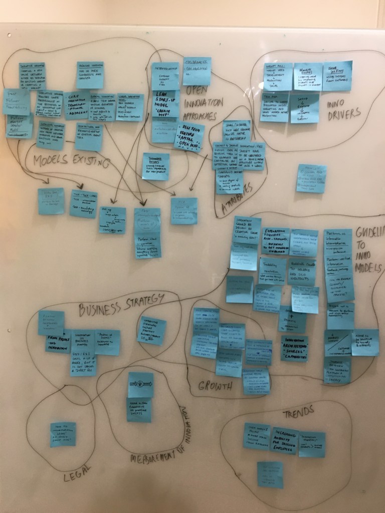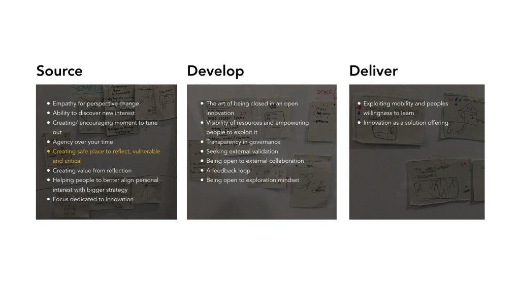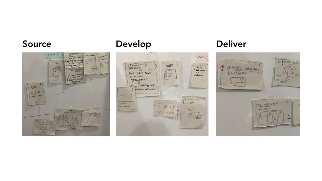 During our ideation we broke down innovation into three phases: source, develop and deliver. We grouped the ideas that came out of the exercise. We dug deeper into the essence of the ideas and extracted the underlying ideas. It was a starting point for developing a service concept.