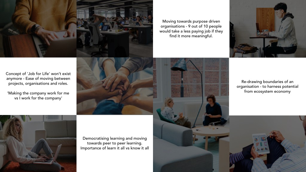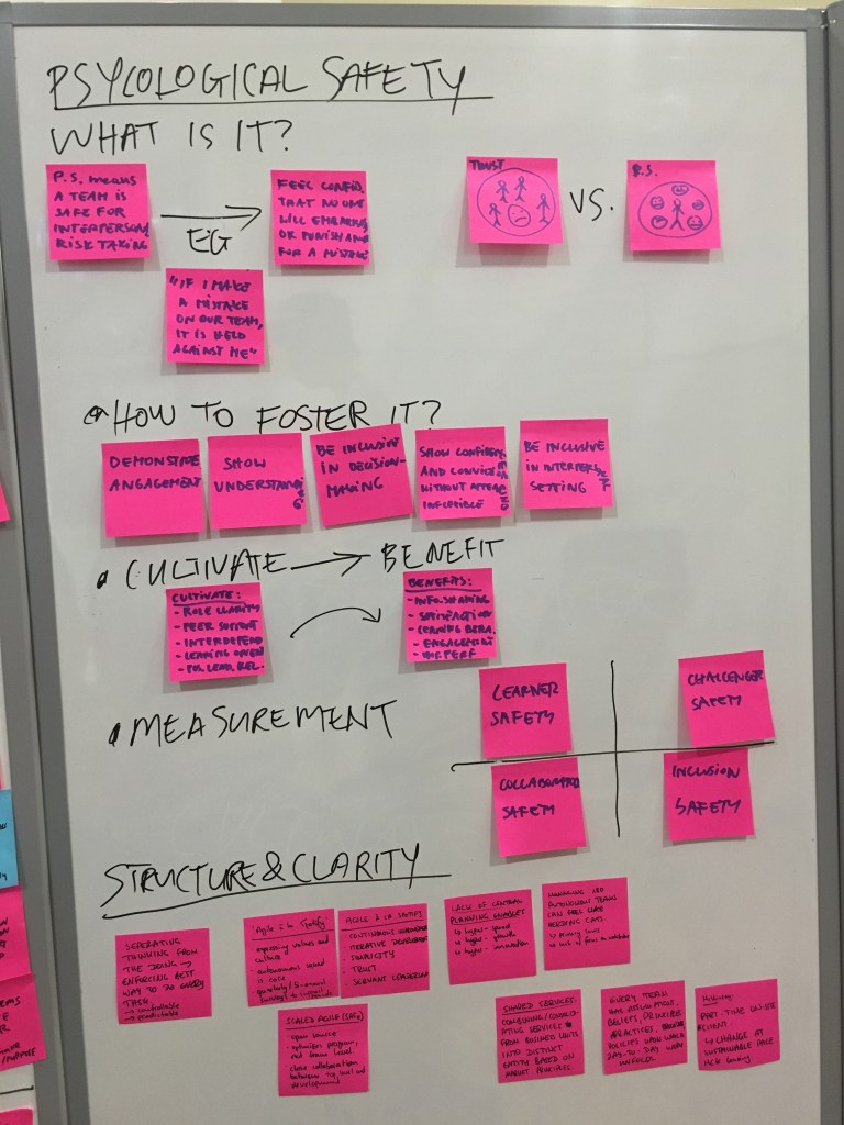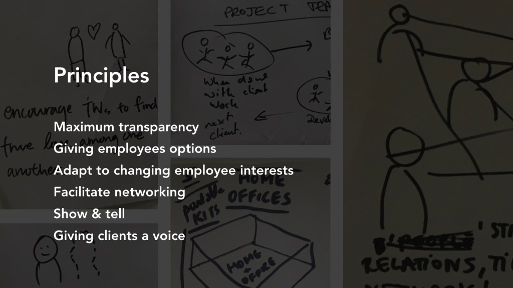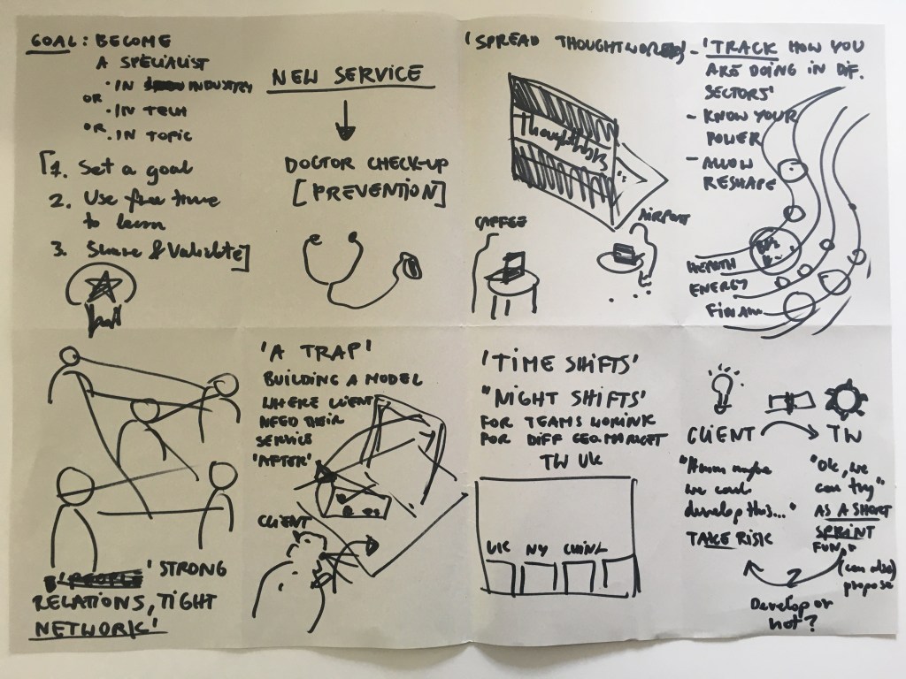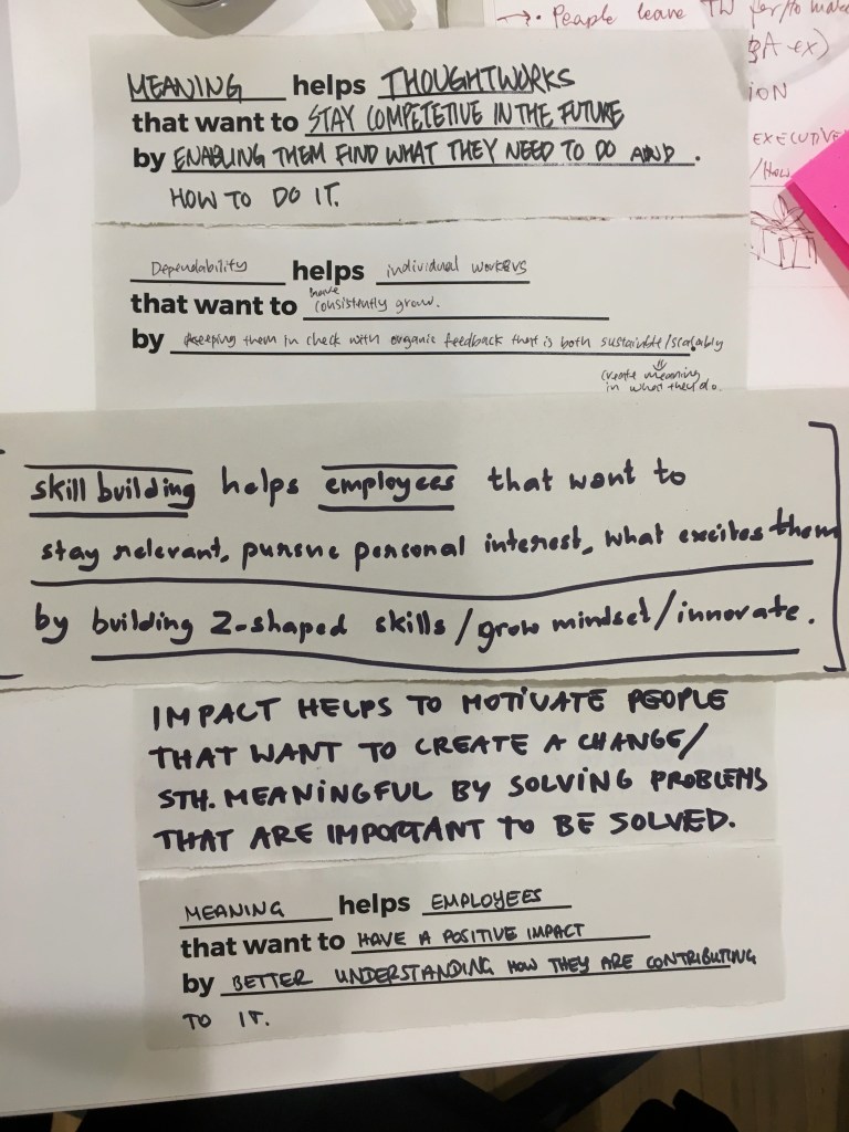 In our research phase for this sprint, we interviewed ThoughtWorkers, other experts and attended relevant talks and events (“Service Design Fringe Festival”). In particular, we tried to understand the building blocks of high performing teams, how we could create meaning at work and how we could build a culture around it. Moreover, we looked at motivations to work, skill building and how organisations engage their employees.